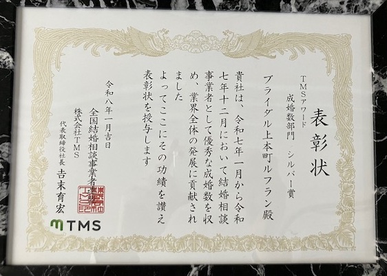 ブライダル上本町ルフランのこれまでの認定証や表彰状のご紹介です。